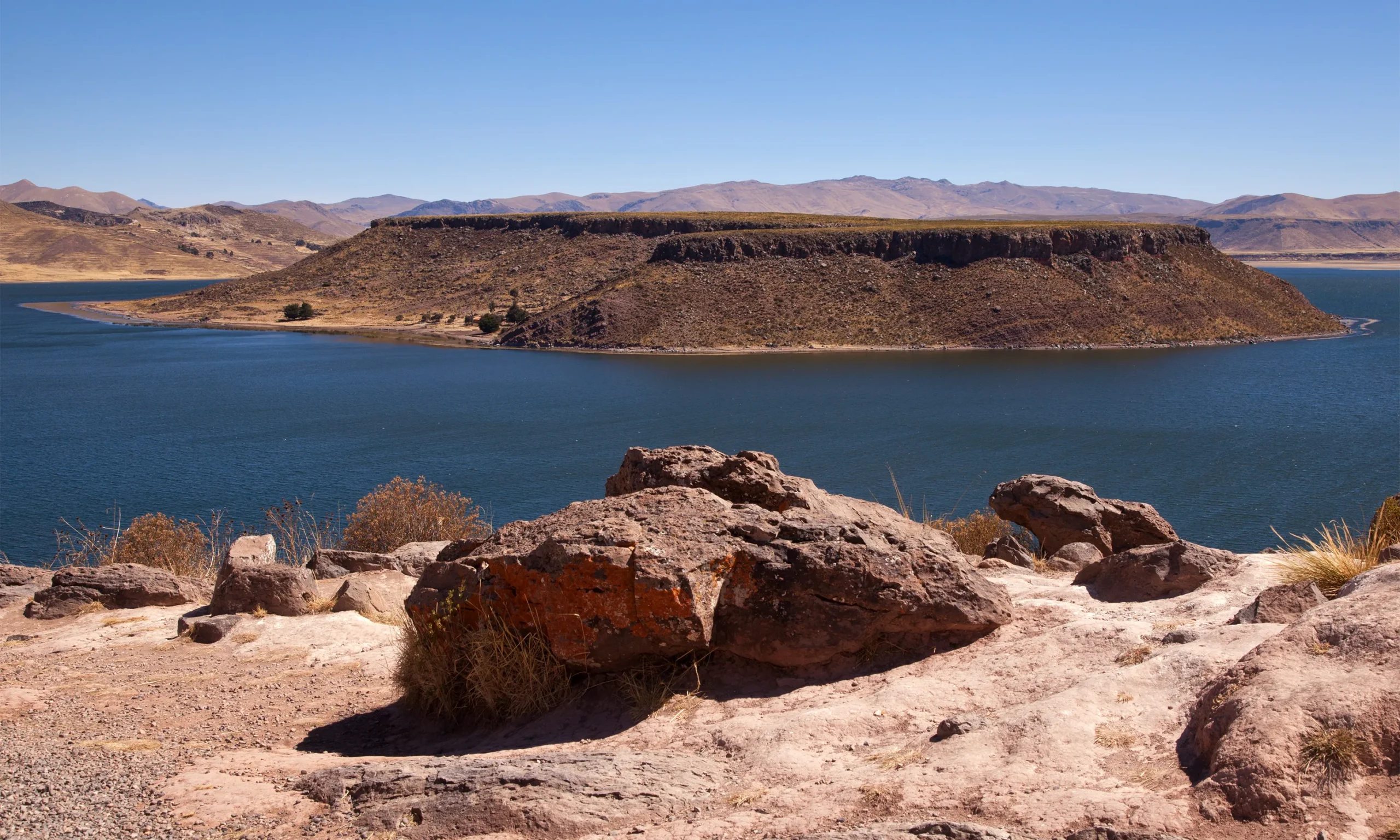 El Lago Umayo está rodeado de suaves colinas cubiertas de ichu, y su silueta ovalada alberga en su centro una isla conocida como la Isla Umayo, que realza el misticismo del lugar. El entorno ofrece vistas panorámicas espectaculares, especialmente durante el amanecer y el atardecer, cuando el cielo se tiñe de dorado y las montañas se reflejan en el agua.