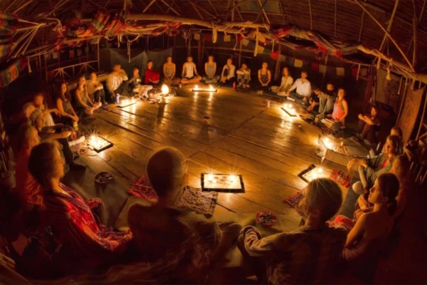 A cerimônia noturna começará em um espaço ritualizado. O uso das plantas mestras é totalmente voluntário e realizado sob rigorosa orientação. Para aqueles que não desejam participar, oferecemos uma sessão alternativa de meditação profunda com sons da selva.