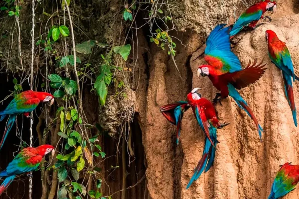- Salida muy temprano (antes del amanecer) en bote para visitar la collpa de guacamayos, una pared arcillosa en la ribera del río donde se congregan cada mañana decenas de loros y guacamayos.
